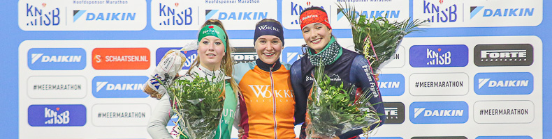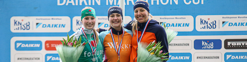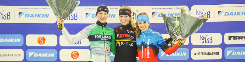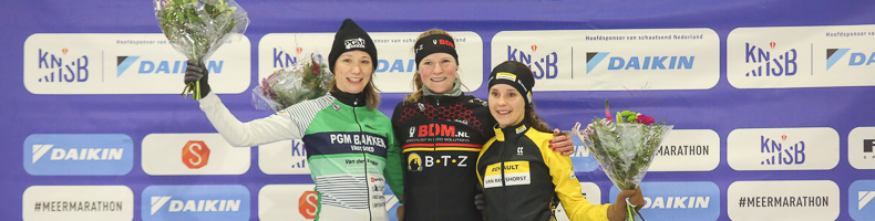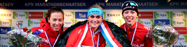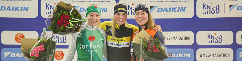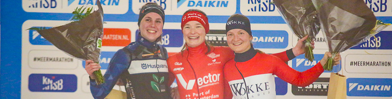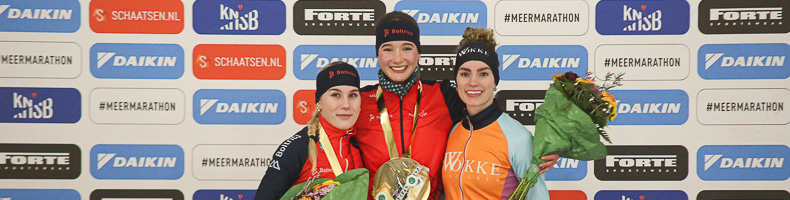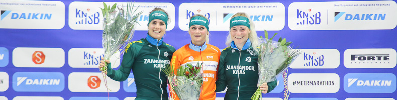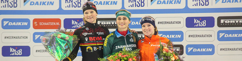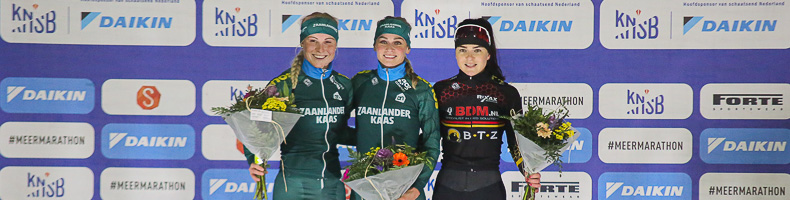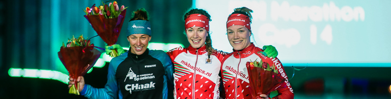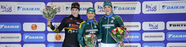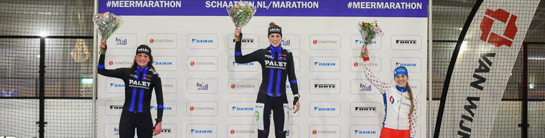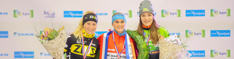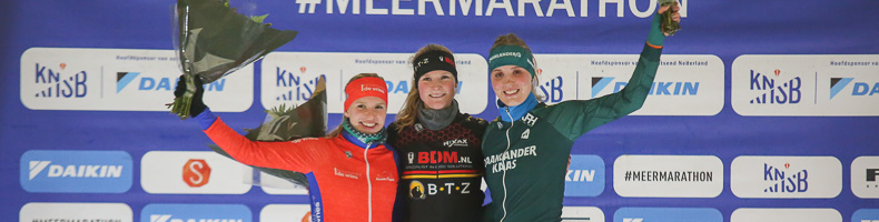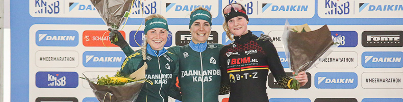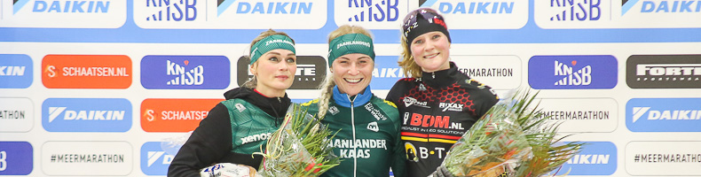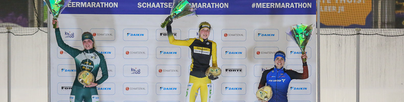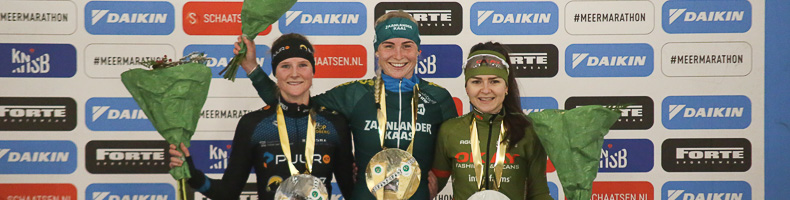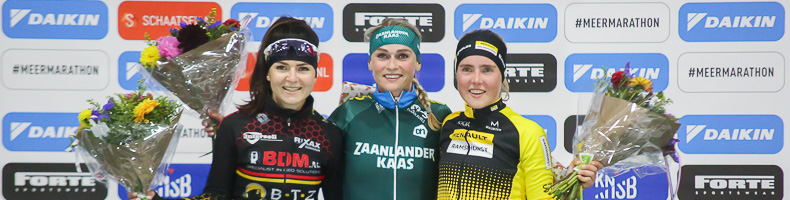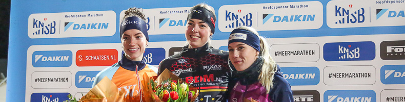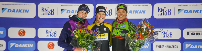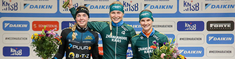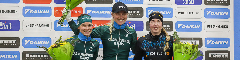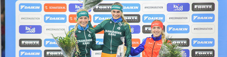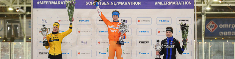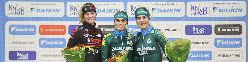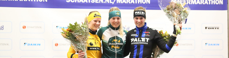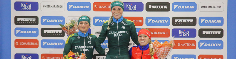 Weer Thialfwinst Irene Schouten, op marathonpodium geflankeerd door Zaanlanderploeggenoten