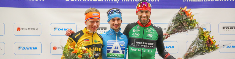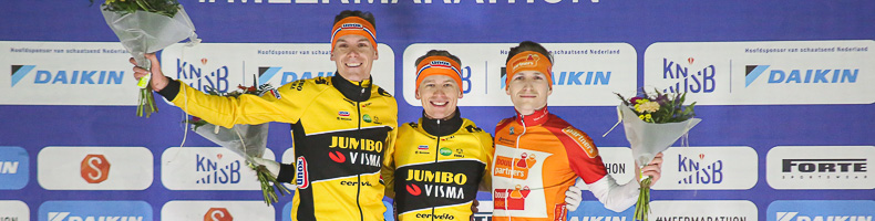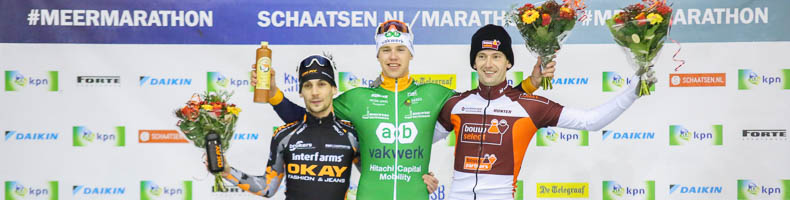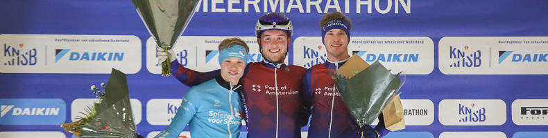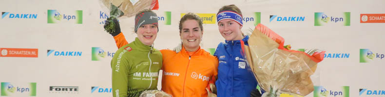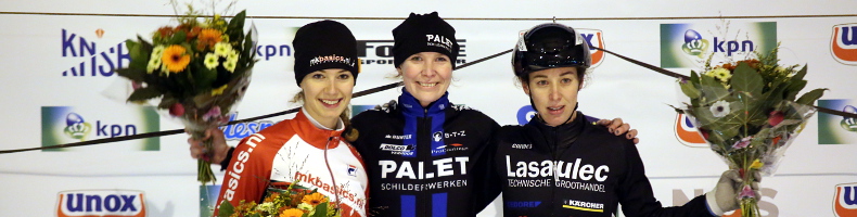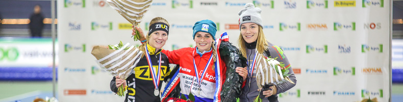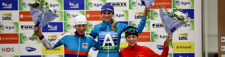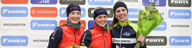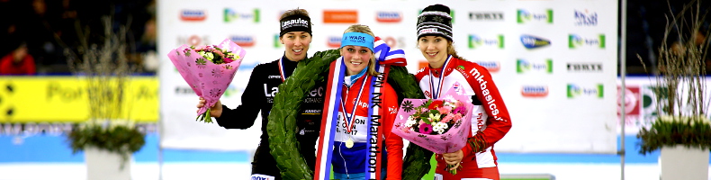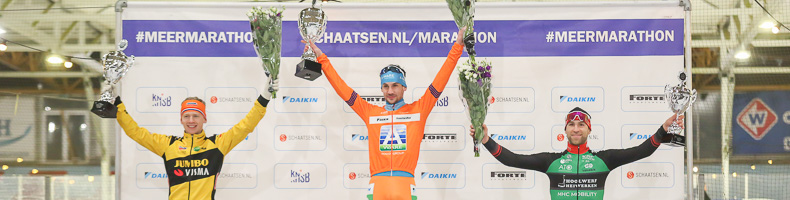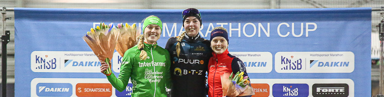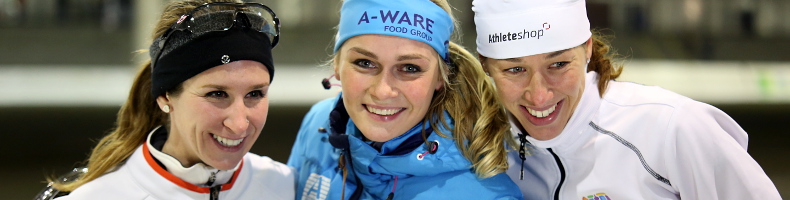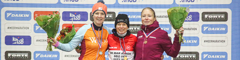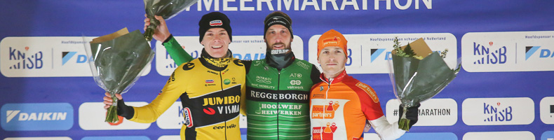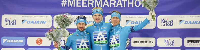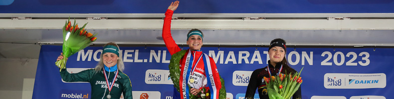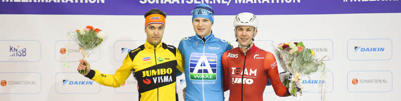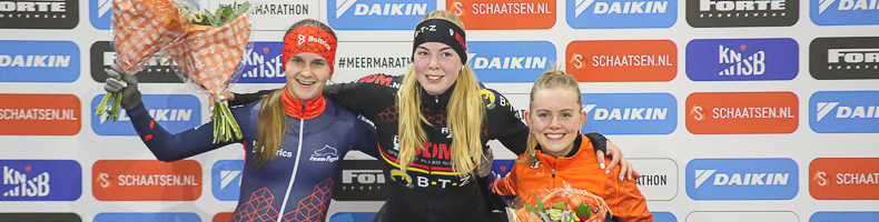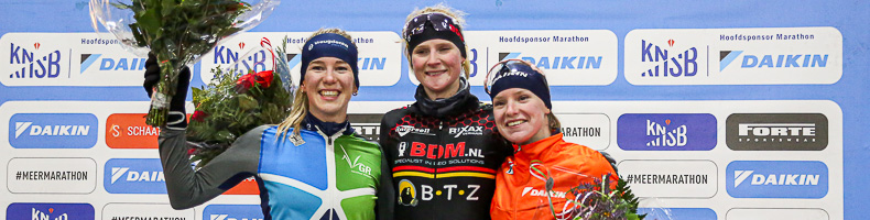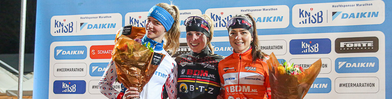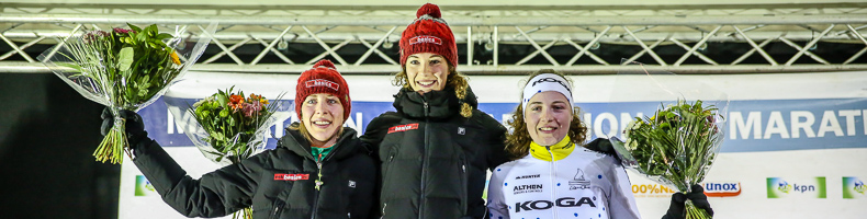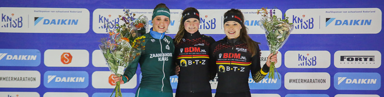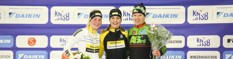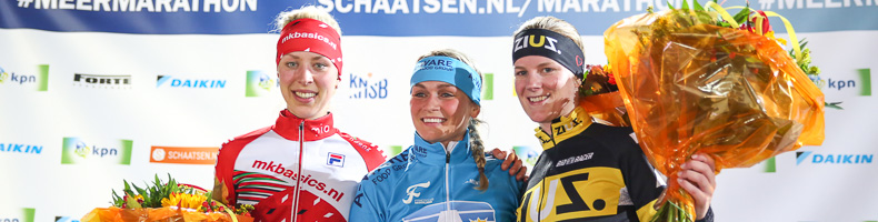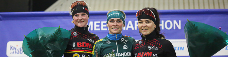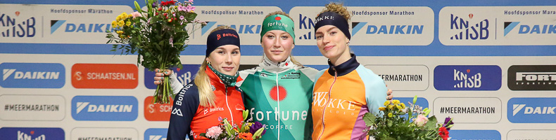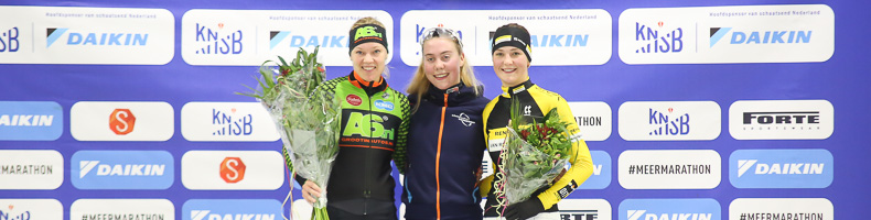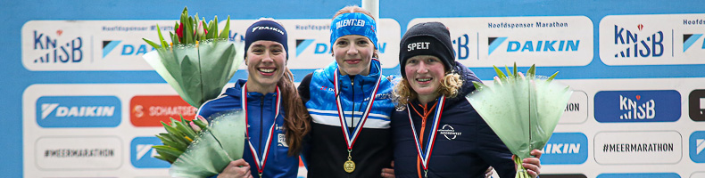Weer Thialfwinst Irene Schouten, op marathonpodium geflankeerd door Zaanlanderploeggenoten