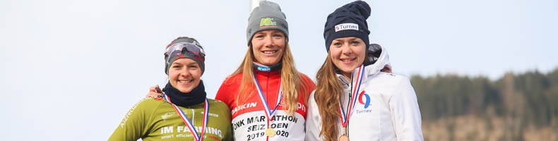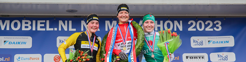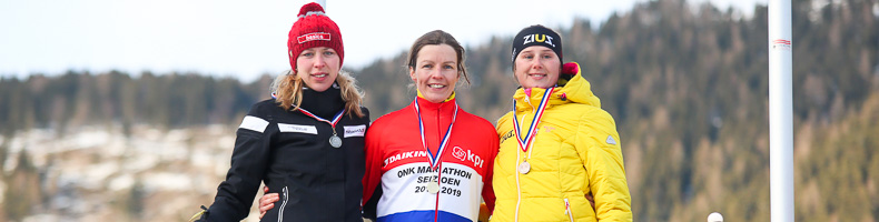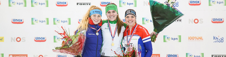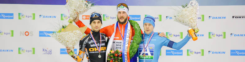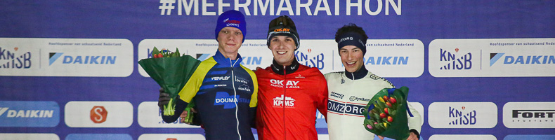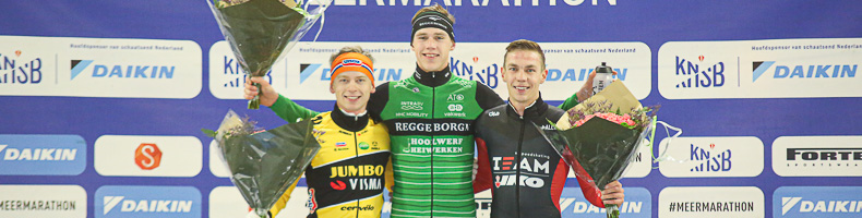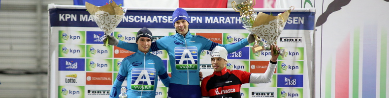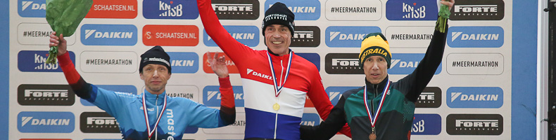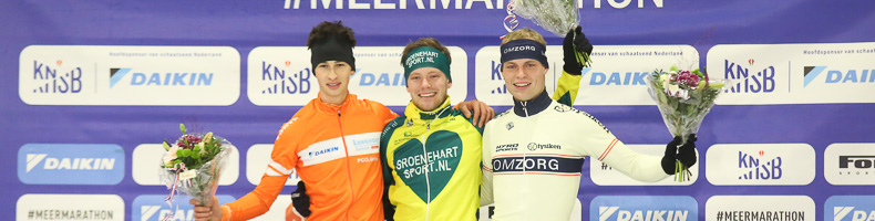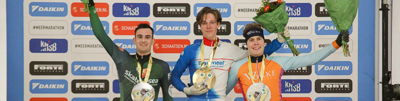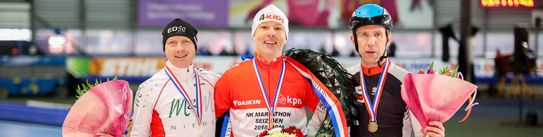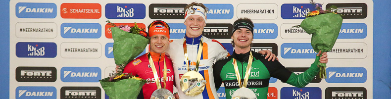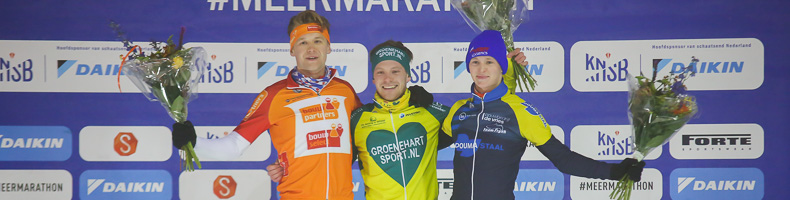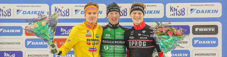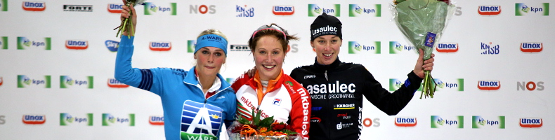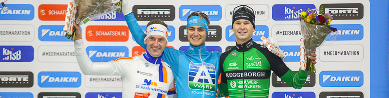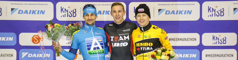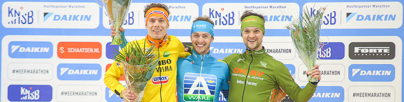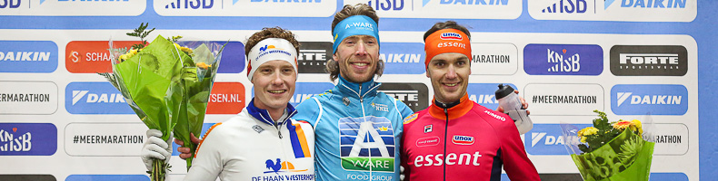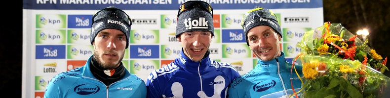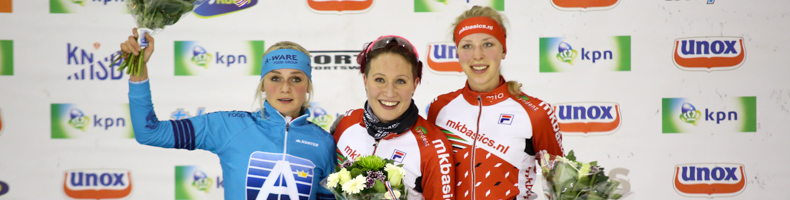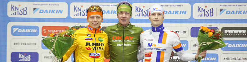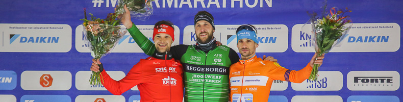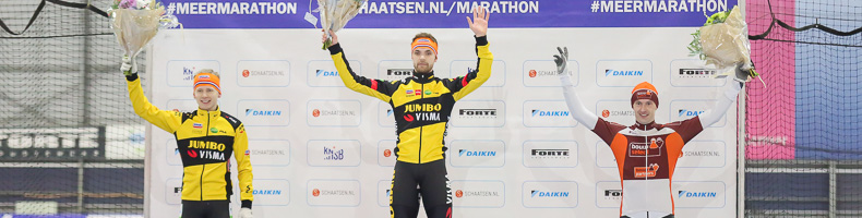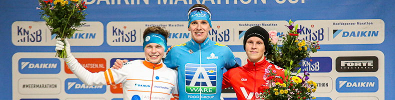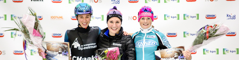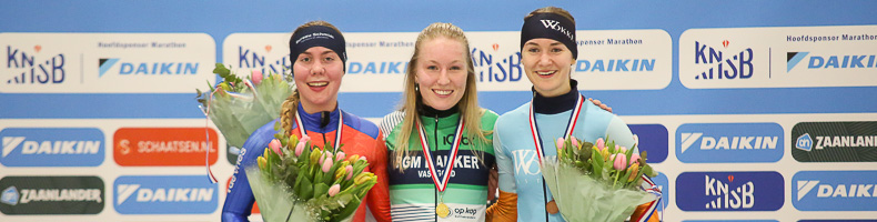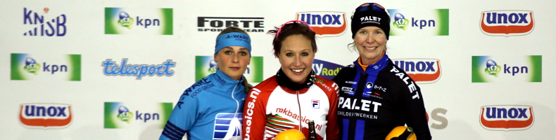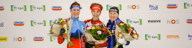 Weer Thialfwinst Irene Schouten, op marathonpodium geflankeerd door Zaanlanderploeggenoten