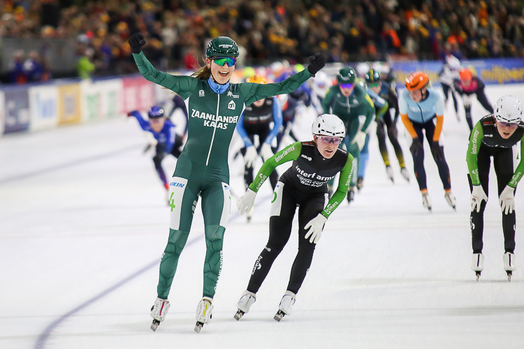 De marathon na afloop van het olympisch kwalificatietoernooi is gewonnen door Sofia Schilder (Albert Heijn Zaanlander). De wedstrijd die in Thialf met 40 ronden de helft van de normale vrouwenafstand was en niet meetelde voor de Daikin Marathon Cup eindigde in een massasprint. Schilder, tweede kerstdag nog winnares op het natuurijs van Wilderswijk, was hierin sneller dan Lianne van Loon (Interfarms / Galesloot Constructie Bedrijf) en Jet Fransen (OKAY / Vreugdenhil Dairy Foods) en behaalde zo haar eerste kunstijsoverwinning. Het na afloop van het OKT nog talrijk aanwezige publiek kreeg een aantrekkelijke wedstrijd voorgeschoteld waar echter geen moment een vluchter kans leek te maken op de winst.