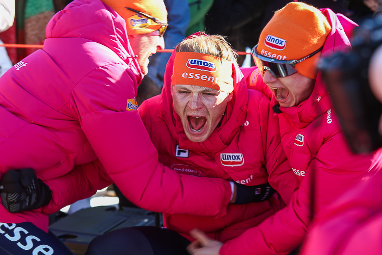 De sprint die vervolgens de winnaar ging bepalen was er een die een ware thriller genoemd mag worden. Eerst schopte Jordy Harink met een laatste krachtsinspanning in het ijs en kwam vervolgens bijna ten val. Daan Gelling en Ronald Haasjes vonden elkaar zelfs echt en belandde zo na de finish samen op het ijs in de finishstraat. Echte schade leek hier niet te zijn en ze stonden beiden weer op om hun ploegbegeleiders op te zoeken in afwachting van de uitslag. Die uitslag liet lang op zich wachten.