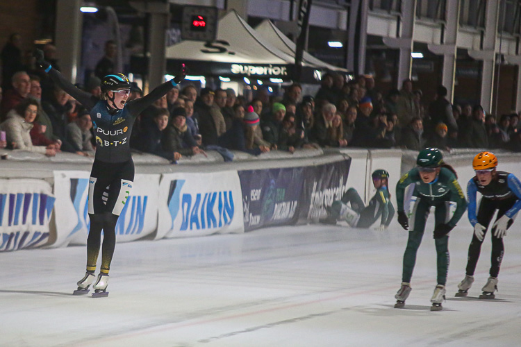 Een week na haar allereerste overwinning heeft Gioya Lancee (Puur ICT / BTZ) ook de cupwedstrijd in Breda op haar naam geschreven. In de sprint bleef Lancee Sofia Schilder (Albert Heijn Zaanlander) en Tessa Snoek (OKAY / Vreugdenhil Dairy Foods) voor. In de sprint kwam Maaike Verweij (Albert Heijn Zaanlander) ten val, krabbelde nog op en behaalde met een negentiende plek 2 punten. Dit was voor Verweij niet voldoende om een door ziekte al vroeg in de wedstrijd afhakende Kim Talsma (Interfarms / Galesloot Constructie Bedrijf) uit het oranje leiderspak te schaatsen.